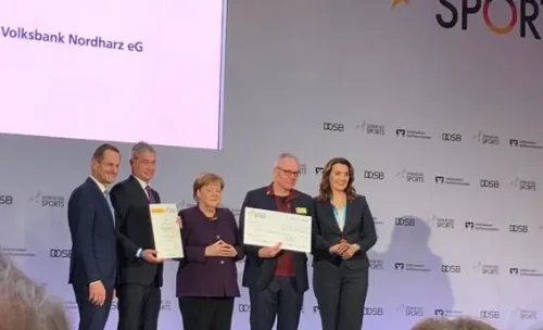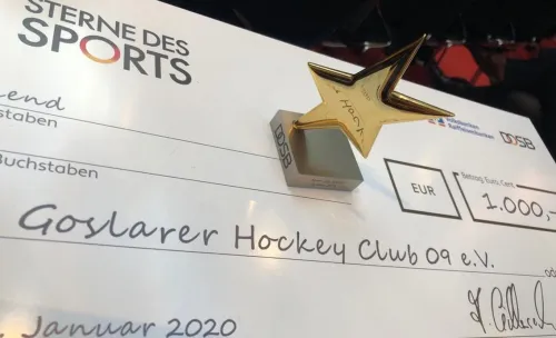 21.01.2020 - In Berlin wurde am heutigen Dienstag der "Große Stern des Sports" verliehen. Mit dabei auch der Goslarer Hockey-Club 00, der die regionale Auswahl der "Sterne des Sports" in Niedersachsen gewonnen hatte. Mit dem Wettbewerb wird das gesellschaftspolitisch wirksame Leistungsspektrum von Sportvereinen und deren besonderes ehrenamtliches Engagement gewürdigt. Er zeichnet entsprechende Tätigkeiten und Projekte aus. Bei der Preisverleihung in Berlin kam der Goslarer HC zwar nicht auf einen der ersten drei Plätze, doch allein die Teilnahme ist eine riesige Anerkennung für die dortige Entwicklungsarbeit. DHB-Präsidentin Carola Meyer und Maren Boye, DHB-Direktorin Sportentwicklung, waren unter den ersten Gratulanten vor Ort.