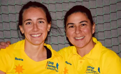 Auf jeweils 300 Spiele können jetzt auch Gabriele Schmitz von RW Köln und Natalie Giannouli (Foto: H. Siegert) vom SC Frankfurt 80 zurückblicken. Gaby Schmitz leitete zusammen mit Thomas Hinsken die Herrenpartie in der 2. Bundesliga zwischen DSD Düsseldorf und SW Neuss und wurde von DHB-Vorstand Schiedsrichter Peter von Reth (Foto r.o., Mitte) zum Jubiläum überrascht. und Natalie Giannouli mit Lena Oßwald (auf dem Foto links) zusammen das Damen-Bundesligaspielpiel beim Mannheimer HC gegen den Nürnberger HTC.