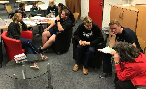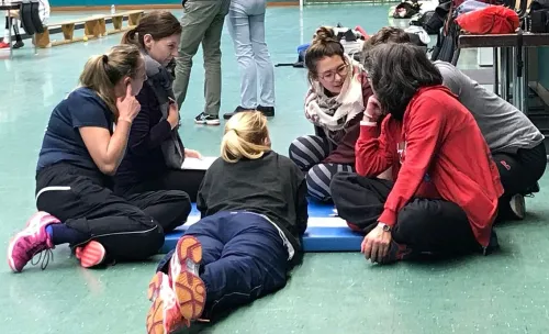 Auf die Frage: „Ist denn alles so viel anders?“ ging im Anschluss Nico Niermann von der DjK Köln in aktiver Kleingruppenarbeit ein. Mit Hilfe von Modifizierungstechniken war es die Aufgabe der Teilnehmer, Übungen und Spiele auf die Besonderheiten der Behinderungen zu modifizieren und auf die geringste Anforderungsstufe herunterzubrechen. „Das Spiel Brückenwächter ist doch schon einfach!?“, würde man denken, aber nach kurzer Überlegung gingen rege Diskussionen los und diverse Ideen kreisten in den Kleingruppen, deren Ergebnisse eine Vielzahl an Modifizierungen für die unterschiedlichsten Levels ergaben.