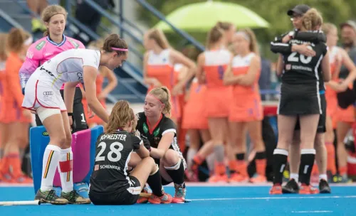 Die Partie konnte erst mit 20 Minuten Verspätung begonnen werden. Starke Regenfälle hatten den Platz unter Wasser gesetzt. Auch als es dann losging, herrschten teils grenzwertige Bedingungen, weil der Ball im triefnassen Grund nicht wie gewohnt lief. Dies beeindruckte die deutsche Mannschaft genauso wie der Umstand, dass neben Emily Günther (Daumenbruch im England-Spiel) kurzfristig auch noch Tara Duus mit Rückenbeschwerden ausfiel. „Es wäre nicht vertretbar gewesen, sie einzusetzen. Aber gleich zwei solcher Verluste sind halt auf Dauer schwer zu kompensieren“, sagte Teammanagerin Michaela Scheibe.